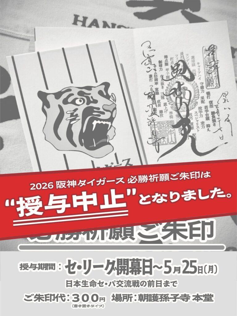 ご朱印をお出しした寺院の責任として、このたび「絶対勝つぞ!タイガース‼︎ 必勝祈願ご朱印」の授与を本日(4/6)をもって「中止」することと決定をいたしました。ご朱印をいただくご予定だった皆さまにおかれましては大変ご迷惑をおかけしますこと、深くお詫び申し上げます。また今後、このような事象が起きぬよう再発の防止に努める所存です、申し訳ありませんでした。